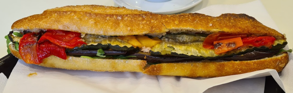 I never go to the Left Bank except when I have to run an errand at the Apple store, but I was rewarded by a boulangerie just next to it, that strikes the note between “just a normal boulangerie with a lunchtime crowd” and “a very good boulangerie.” The sandwich des legumes is gorgeous, with perfect bread, perfect peppery roquette and beautifully grilled vegetables for under 5 €. I suspect the other stuff isn’t bad either.
